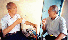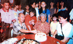 蔡洪钟(左)和他的得意门生俞隆庆在交谈。俞隆庆是《蔡洪钟水彩画集》的编者与出版者。 | 三年前,蔡洪钟的儿孙们为他和夫人庆祝生日。 | |