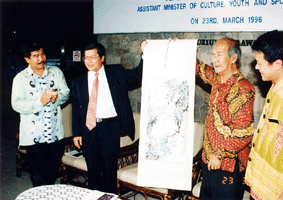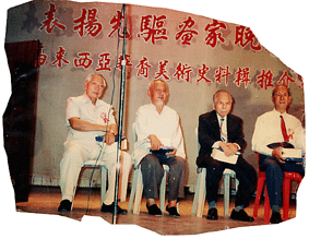 蔡洪钟发言神态(一九九四年)。 | 蔡洪钟(右一)和其他三位马来西亚先驱画家合影。 | |