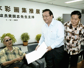 蔡洪钟赠送图画予为美术协会画展主持开幕礼的叶金来助理部长。 | 蔡洪钟赠送水彩画集予黄国忠上议员,右为拿督杨昆贤政务次长。 | |