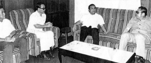 天猛公拿督陈明聪(左一),天猛公陈宗明(左二),丹斯里拿督阿玛黄文彬(右二)拜会前副教育部长拿督陈声新,讨论华小问题。 | 古晋中华第六小学落成开幕时,带领首相参观展览。 | |
