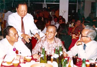 年轻时的本固鲁罗仲勋。 | 早年热心社会工作的本固鲁罗仲勋与已故前副首长丹斯里沈庆鸿、已故拿督张君光及拿督阿玛黄金明昔日在一项晚会上相聚的一个镜头。 |