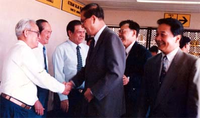 本固鲁罗仲勋(左一)与田绍熙(左二)及已故丹斯里拿督阿玛黄文彬在机场迎接佳宾,右一为拿督斯里黄顺舸。 |